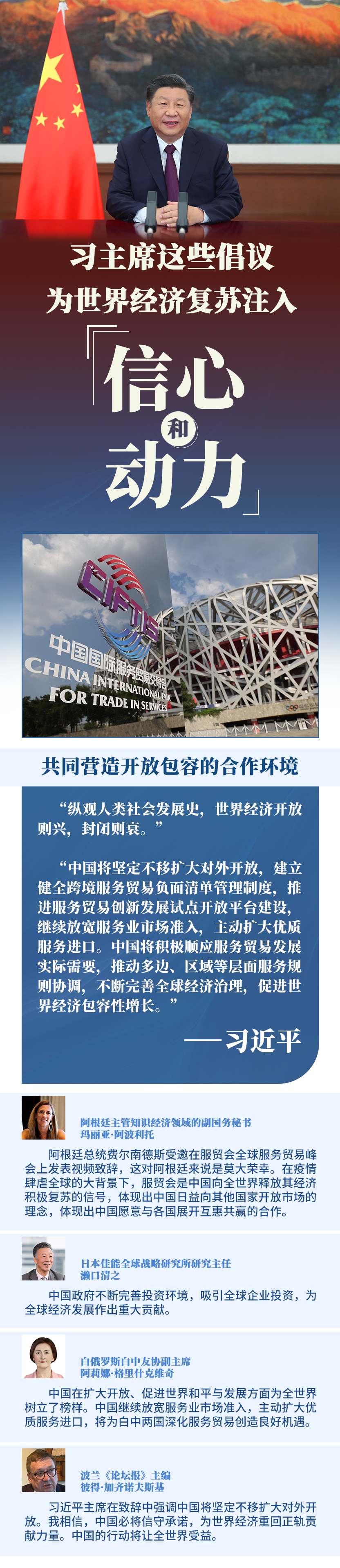 在全球范圍新冠疫情尚未得到全面控制、經(jīng)濟(jì)全球化遭遇逆流的背景下,習(xí)主席就促進(jìn)全球服務(wù)業(yè)開(kāi)放合作提出3點(diǎn)倡議,為推動(dòng)世界經(jīng)濟(jì)盡快復(fù)蘇注入信心和動(dòng)力,向國(guó)際社會(huì)展現(xiàn)中國(guó)負(fù)責(zé)任大國(guó)的作為和擔(dān)當(dāng)。