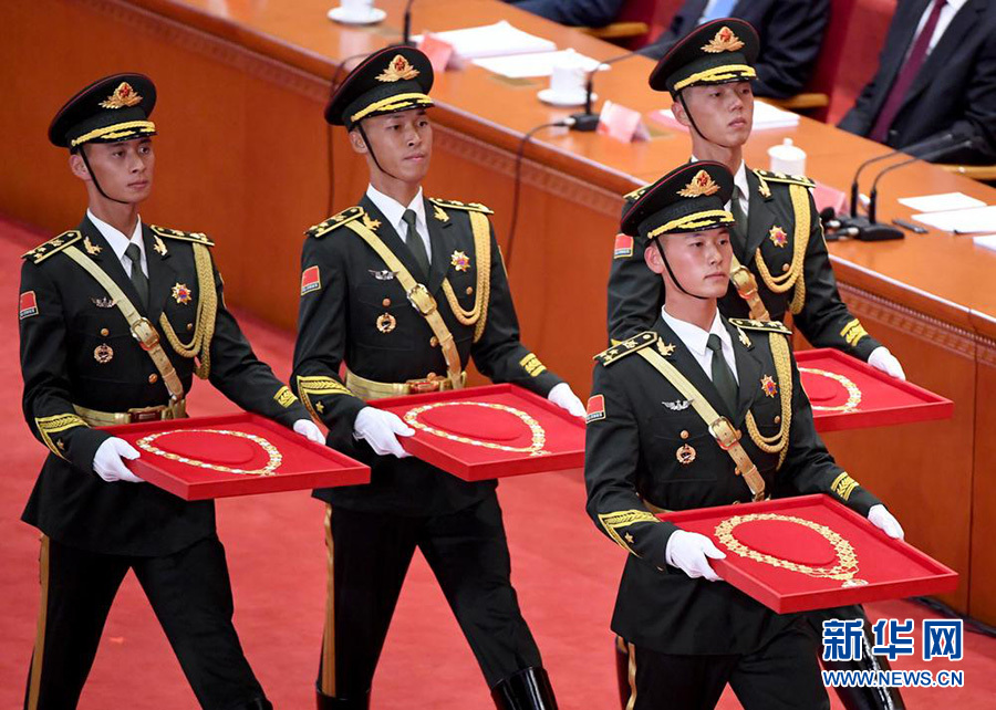 9月8日上午,全國抗擊新冠肺炎疫情表彰大會上,4名禮兵手捧共和國勛章、國家榮譽稱號獎?wù),行進到儀式現(xiàn)場。新華社記者 岳月偉 攝