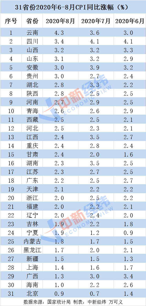 分省份來看,云南、四川、山西、山東等12省份8月份CPI同比漲幅超過全國水平,江西、重慶、甘肅等3地漲幅與全國持平,湖南、江蘇、廣東等16省份漲幅低于全國。其中,云南8月份CPI同比上漲4.3%,領(lǐng)漲全國;北京CPI同比上漲0.9%,漲幅全國最低。