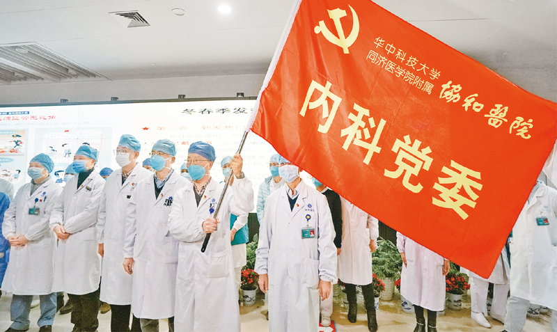 2020年1月22日,華中科技大學(xué)同濟(jì)醫(yī)學(xué)院附屬協(xié)和醫(yī)院內(nèi)科30余名醫(yī)務(wù)人員組成抗擊新冠肺炎突擊隊(duì),投入到協(xié)和醫(yī)院對(duì)口支持的發(fā)熱定點(diǎn)醫(yī)院——武漢紅十字會(huì)醫(yī)院的工作中去。圖為醫(yī)務(wù)人員宣誓成立突擊隊(duì)。 新華社記者 程敏/攝