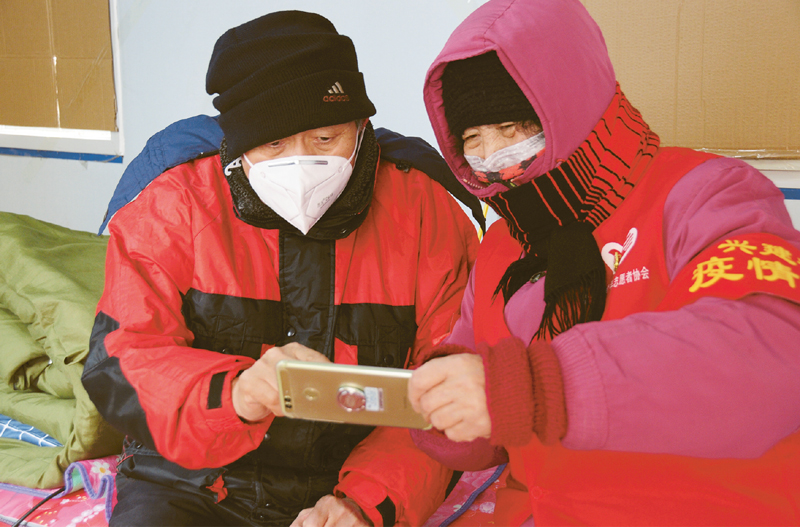 今年70歲的于慶河和69歲的黃玉芹是住在黑龍江哈爾濱平房區(qū)興建街道上海新村社區(qū)的一對(duì)夫妻,兩人都是有多年黨齡的老黨員。面對(duì)疫情,夫妻二人第一時(shí)間報(bào)名加入志愿者團(tuán)隊(duì),積極參加社區(qū)疫情防控值勤工作。圖為2020年3月3日,于慶河(左)、黃玉芹在閑暇時(shí)通過手機(jī)與兒子、兒媳互報(bào)平安。 新華社記者 強(qiáng)勇/攝