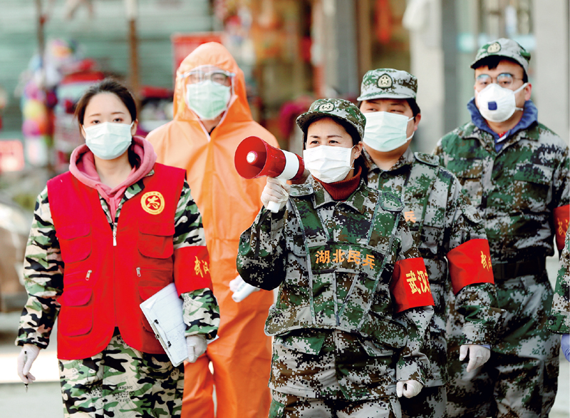 疫情防控阻擊戰(zhàn)打響后,湖北省武漢市江岸區(qū)人武部每天組織300多名民兵24小時值守在全區(qū)17個街道52個疫情防控值勤點崗位,宣傳新冠肺炎疫情防控、測量體溫、排查登記居民信息,為居民送菜代購生活物資和藥品、為社區(qū)居民守好健康之門,筑起疫情防控的銅墻鐵壁。圖為2020年2月20日,江岸區(qū)人武部組織民兵在后湖南街建設新村社區(qū)宣傳疫情防控。 湖北日報記者 張鴻/攝