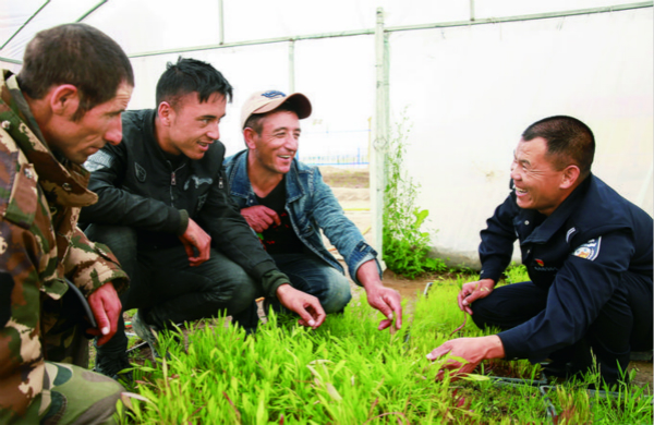 ▲ 新疆紅其拉甫邊檢站民警孫超向塔吉克族牧民傳授種植技術(shù)。