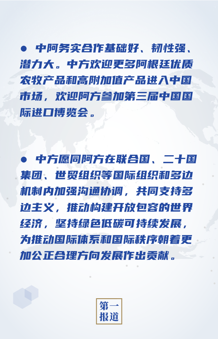 習(xí)近平強(qiáng)調(diào),中方高度重視同阿根廷的關(guān)系,支持阿方發(fā)展經(jīng)濟(jì)、改善民生,對中阿合作未來充滿信心。中國將全面提高對外開放水平,推動(dòng)形成以國內(nèi)大循環(huán)為主體、國內(nèi)國際雙循環(huán)相互促進(jìn)的新發(fā)展格局。這將為包括阿根廷在內(nèi)的世界各國提供廣闊市場和發(fā)展機(jī)會(huì)。中阿務(wù)實(shí)合作基礎(chǔ)好、韌性強(qiáng)、潛力大。中方歡迎更多阿根廷優(yōu)質(zhì)農(nóng)牧產(chǎn)品和高附加值產(chǎn)品進(jìn)入中國市場,歡迎阿方參加第三屆中國國際進(jìn)口博覽會(huì)。雙方應(yīng)落實(shí)好現(xiàn)有重大項(xiàng)目,開辟合作新疆域,深化人文交流,推動(dòng)中阿全面戰(zhàn)略伙伴關(guān)系取得更大發(fā)展。