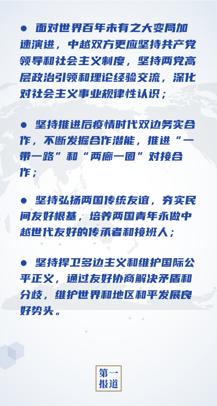 習(xí)近平強(qiáng)調(diào),中國和越南山水相連,兩國在意識(shí)形態(tài)、發(fā)展道路、社會(huì)制度、價(jià)值理念等方面高度一致,把雙邊關(guān)系發(fā)展好符合兩國和兩國人民根本利益。今年是中越建交70周年,兩黨兩國關(guān)系邁上新的歷史起點(diǎn)。疫情之下中越雙邊貿(mào)易等合作呈現(xiàn)出強(qiáng)勁增長勢頭,彰顯了中越關(guān)系的韌性和潛力。面對世界百年未有之大變局加速演進(jìn),中越雙方更應(yīng)堅(jiān)持共產(chǎn)黨領(lǐng)導(dǎo)和社會(huì)主義制度,堅(jiān)持兩黨高層政治引領(lǐng)和理論經(jīng)驗(yàn)交流,深化對社會(huì)主義事業(yè)規(guī)律性認(rèn)識(shí);堅(jiān)持推進(jìn)后疫情時(shí)代雙邊務(wù)實(shí)合作,不斷發(fā)掘合作潛能,推進(jìn)“一帶一路”和“兩廊一圈”對接合作;堅(jiān)持弘揚(yáng)兩國傳統(tǒng)友誼,夯實(shí)民間友好根基,培養(yǎng)兩國青年永做中越世代友好的傳承者和接班人;堅(jiān)持捍衛(wèi)多邊主義和維護(hù)國際公平正義,通過友好協(xié)商解決矛盾和分歧,維護(hù)世界和地區(qū)和平發(fā)展良好勢頭。中國共產(chǎn)黨支持越南共產(chǎn)黨開好十三大,愿繼續(xù)為越南社會(huì)主義建設(shè)事業(yè)提供力所能及的支持和幫助。