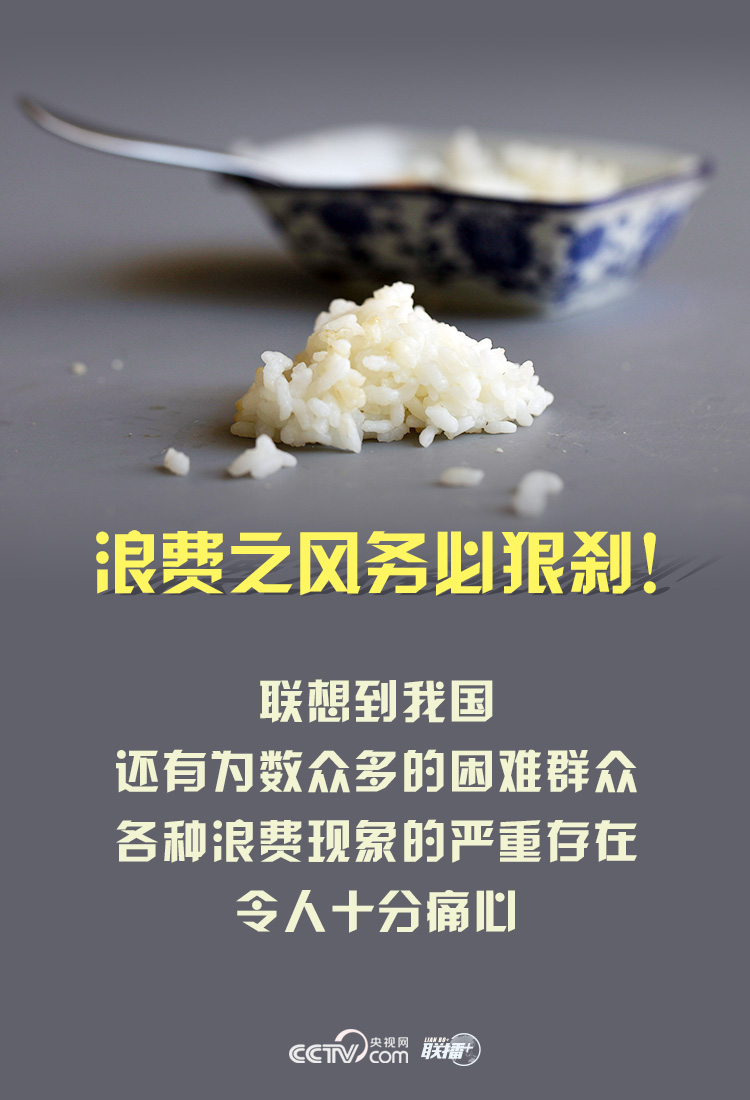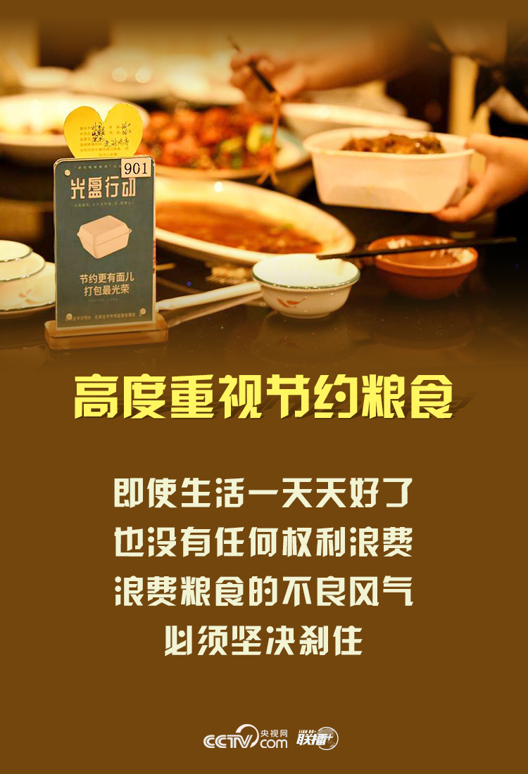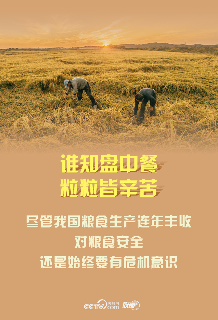 當(dāng)前,受新冠肺炎疫情影響,全球范圍內(nèi)的饑餓人數(shù)有所增加,盡管我國的糧食生產(chǎn)連年豐收,但對(duì)糧食安全仍要有危機(jī)意識(shí)。適逢中秋、國慶雙節(jié)宴請(qǐng)高峰期,牢記“勤儉是我們的傳家寶”,珍惜盤中餐,和總書記一起對(duì)浪費(fèi)說“不”!