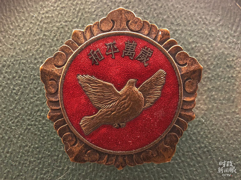 △這是第三屆赴朝慰問(wèn)團(tuán)贈(zèng)給志愿軍的和平萬(wàn)歲紀(jì)念章。(總臺(tái)央視記者許永松拍攝)