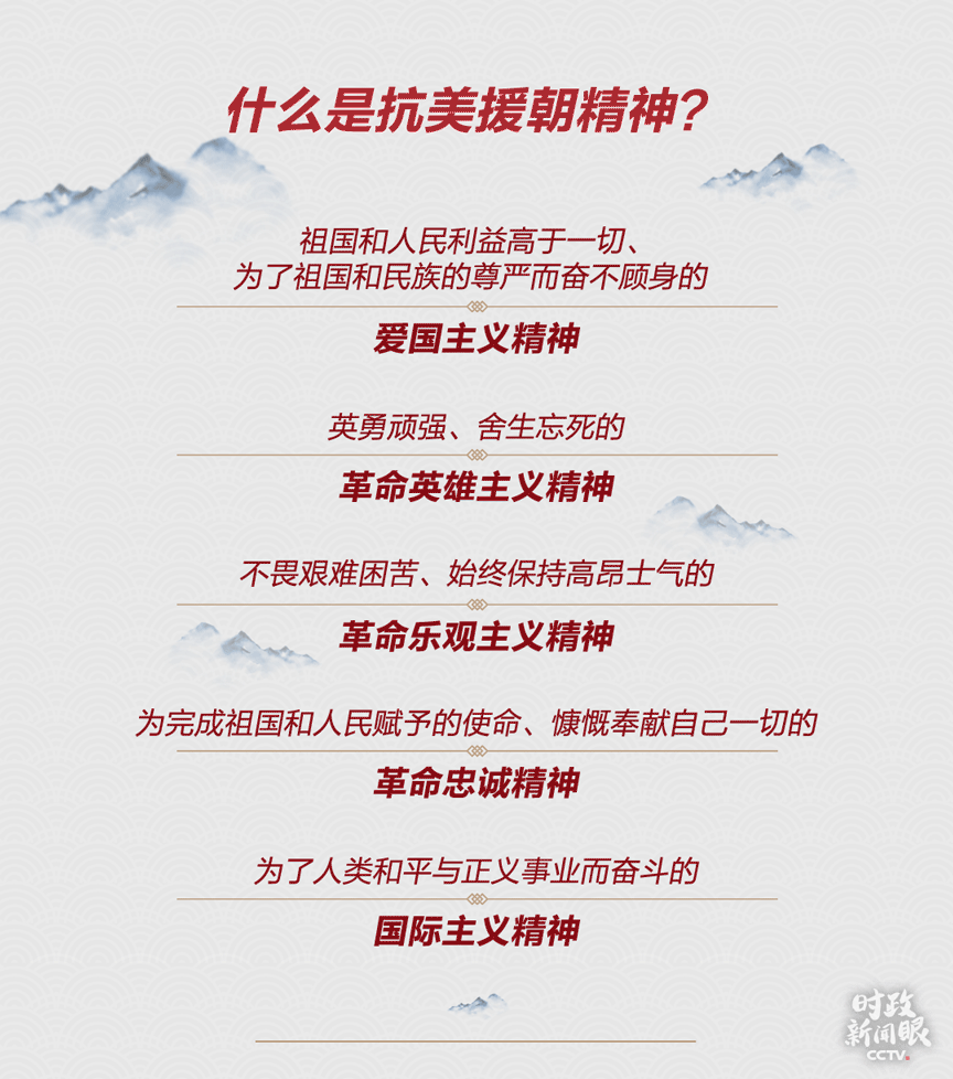 習(xí)近平說(shuō),偉大的抗美援朝精神,是中國(guó)共產(chǎn)黨人和人民軍隊(duì)崇高風(fēng)范的生動(dòng)寫(xiě)照,是中華民族傳統(tǒng)美德和民族品格的集中展示,是以愛(ài)國(guó)主義為核心的民族精神的具體體現(xiàn)。