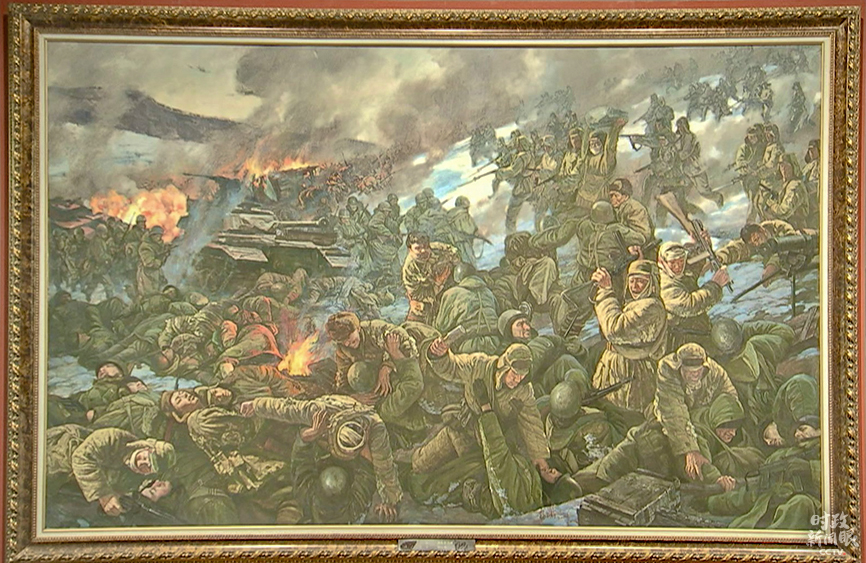 △重現(xiàn)激戰(zhàn)松骨峰場(chǎng)景的油畫(huà)(總臺(tái)央視記者石丞拍攝)