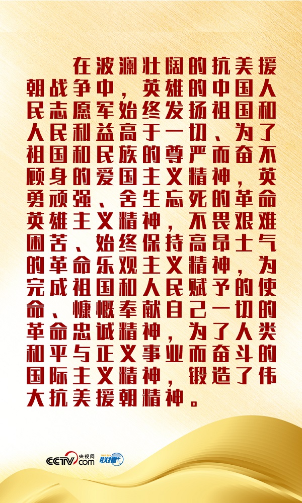 “抗美援朝戰(zhàn)爭偉大勝利,是中國人民站起來后屹立于世界東方的宣言書,是中華民族走向偉大復(fù)興的重要里程碑,對中國和世界都有著重大而深遠(yuǎn)的意義!