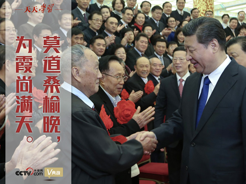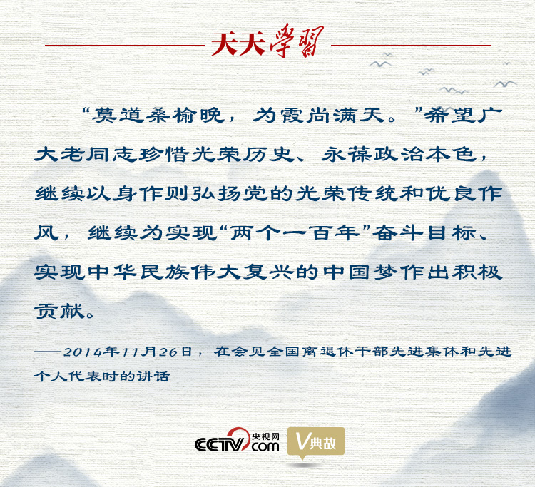 “莫道桑榆晚,為霞尚滿天!2014年11月26日,習(xí)近平總書記在會見全國離退休干部先進(jìn)集體和先進(jìn)個人代表時,用劉禹錫的詩句鼓勵廣大老同志繼續(xù)發(fā)揮余熱,作出積極貢獻(xiàn)。