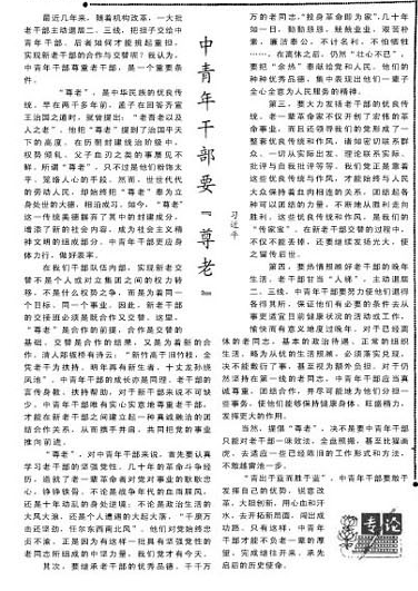 1984年12月7日,習(xí)近平同志在《人民日報》發(fā)表一篇題為《中青年干部要“尊老”》的專論,文章充滿深情地說:“千千萬萬的老同志,‘投身革命即為家’,幾十年如一日,勤勤懇懇,兢兢業(yè)業(yè),艱苦樸素,廉潔奉公,不計名利,不怕犧牲……,在離休之后,仍然‘壯心不已’,要把‘余熱’奉獻(xiàn)給黨和人民。他們的種種優(yōu)秀品德,集中表現(xiàn)出他們一輩子全心全意為人民服務(wù)的精神。”