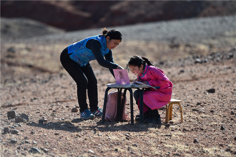 9歲的策耿(右)在家附近的戈壁上網(wǎng)課(4月1日攝)。策耿是內(nèi)蒙古自治區(qū)阿拉善左旗蒙古族學(xué)校四年級(jí)學(xué)生。由于疫情防控,策耿父母長(zhǎng)期雇傭的一名外省羊倌沒能回到當(dāng)?shù)兀患胰酥缓没氐桨⒗谱笃鞛趿K木溫都爾毛道嘎查的牧區(qū)家中照看羊群。期間,策耿一邊協(xié)助父母,一邊上網(wǎng)課。新華社記者 劉磊 攝