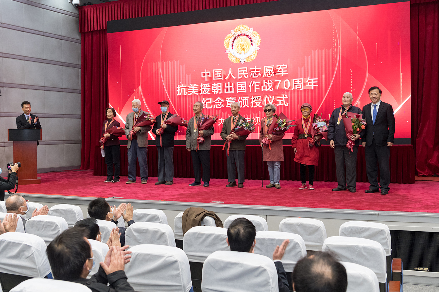 11月2日下午,中央廣播電視總臺舉辦“中國人民志愿軍抗美援朝出國作戰(zhàn)70周年”紀念章頒授儀式,45位(含新影集團16人)老同志榮獲紀念章。中宣部副部長,中央廣播電視總臺黨組書記、臺長、總編輯慎海雄出席并講話?偱_編務會議成員和相關臺領導,各部門、各單位負責同志,總臺離退休干部代表,總臺青年理論學習小組代表參加。