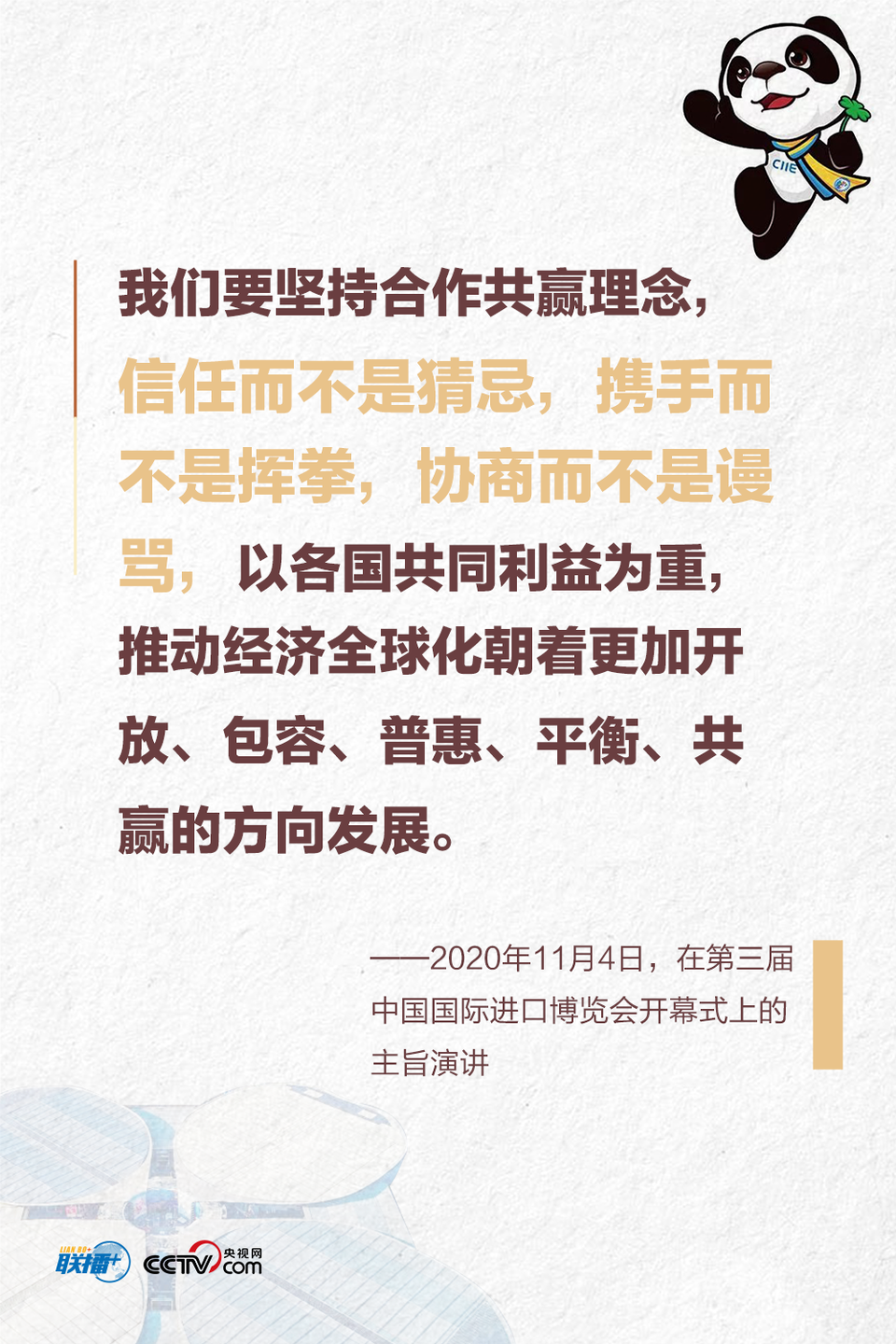 “要堅持合作共贏理念,信任而不是猜忌,攜手而不是揮拳,協(xié)商而不是謾罵,以各國共同利益為重,推動經濟全球化朝著更加開放、包容、普惠、平衡、共贏的方向發(fā)展”,“各國走向開放、走向合作的大勢沒有改變”。