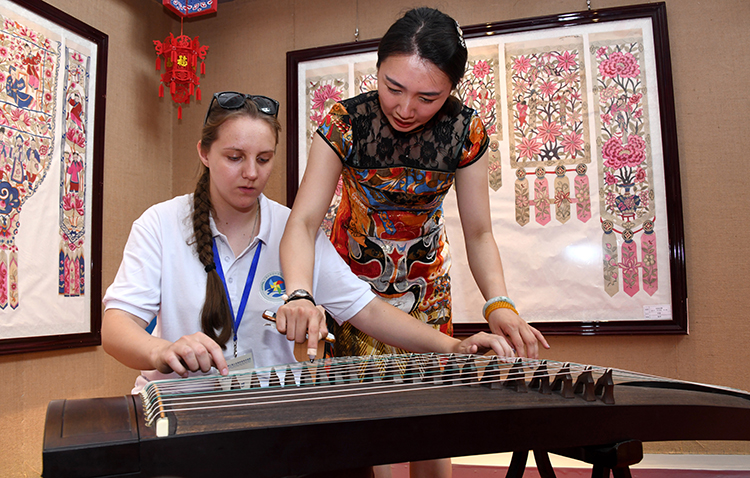2018年7月17日,第三屆上海合作組織青年交流營(yíng)的營(yíng)員在青島參加了一場(chǎng)別開生面的民俗互動(dòng)體驗(yàn)活動(dòng),感受中國(guó)傳統(tǒng)文化。這是來自哈薩克斯坦的薩莎(左)在學(xué)習(xí)古箏彈奏。