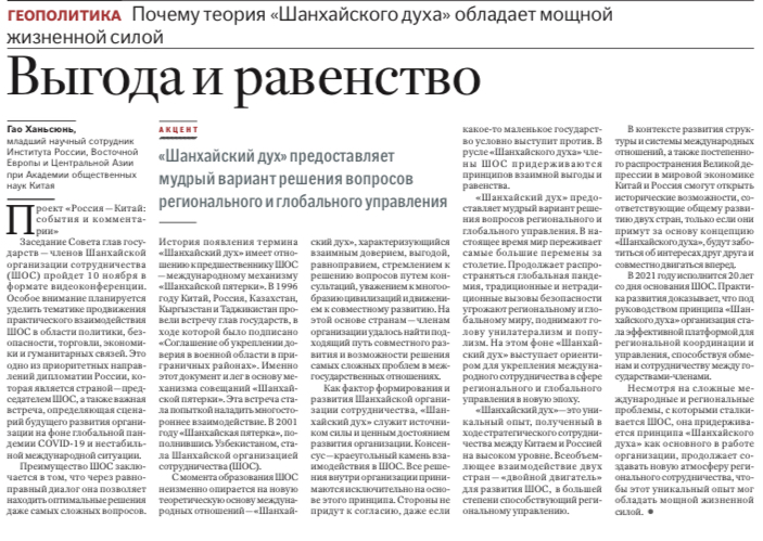 當(dāng)?shù)貢r間11月9日出版的《俄羅斯報》在《中俄銳評》專欄刊發(fā)中國社會科學(xué)院俄羅斯東歐中亞研究所助理研究員高焓迅撰寫的題為《“上海精神”緣何歷久彌新?》的署名文章。文章從不同維度深入闡釋了“上海精神”在引領(lǐng)和推動上合組織發(fā)展過程中所發(fā)揮的重要作用。文章全文如下:
