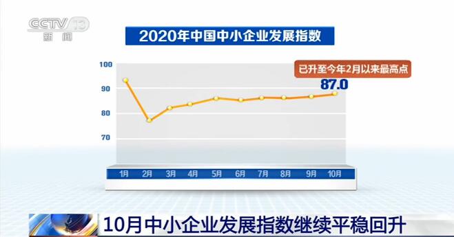 央視網消息:中國中小企業(yè)協(xié)會昨天(10日)發(fā)布數據顯示,10月中國中小企業(yè)發(fā)展指數為87.0,比9月上升0.1個點,已升至今年2月以來最高點。