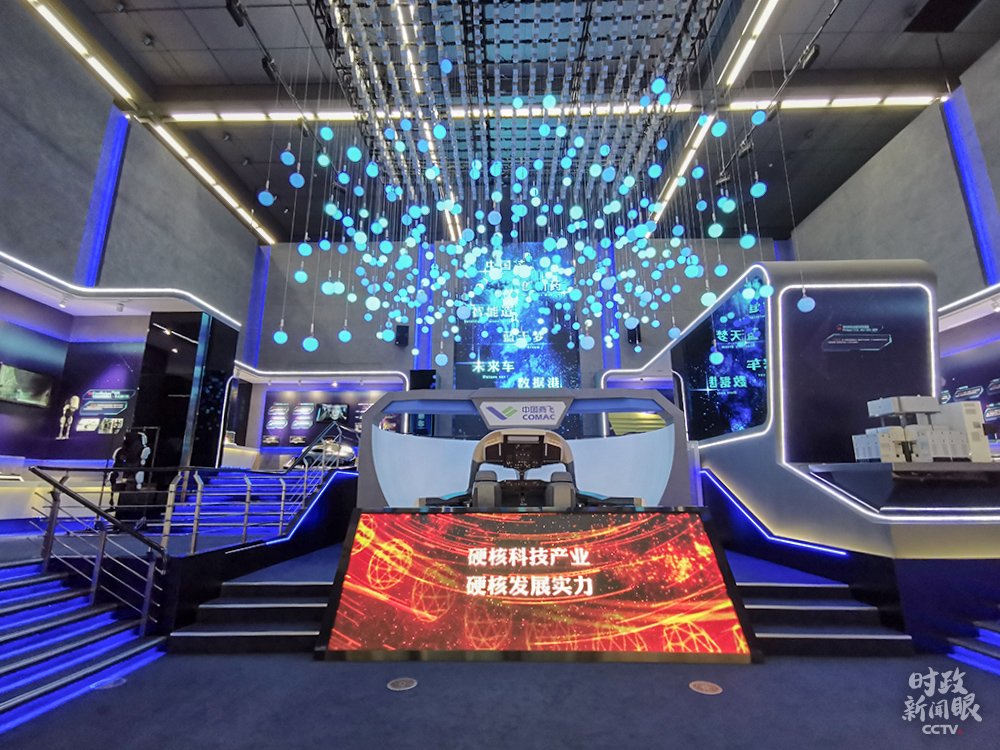 △中國商飛展區(qū)。2017年5月,我國首架具有完全自主知識產(chǎn)權(quán)的大型噴氣式客機(jī)C919在浦東國際機(jī)場首飛成功,中國商飛公司是這架飛機(jī)的主制造商。(總臺央視記者王冰拍攝)