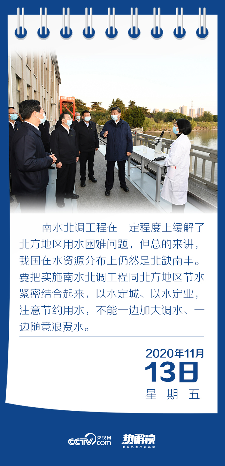 2014年12月,南水北調(diào)中線一期工程正式通水時(shí),總書記又作重要指示,指出南水北調(diào)工程功在當(dāng)代,利在千秋。希望繼續(xù)堅(jiān)持先節(jié)水后調(diào)水、先治污后通水、先環(huán)保后用水的原則,不斷造福民族、造福人民。
