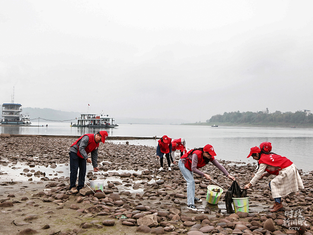 △重慶永川區(qū)志愿者在長江朱沱段撿拾垃圾。