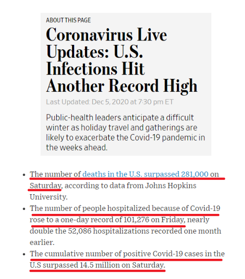 據(jù)美國約翰斯·霍普金斯大學最新統(tǒng)計,截至美東時間5日16時15分(北京時間6日5時15分),全美累計新冠肺炎確診病例超過1450萬,病亡人數(shù)超過28.1萬。而此前一天,美國單日新增確診病例和住院病例分別達到235635例和101276例,雙雙刷新了疫情暴發(fā)以來的最高紀錄。