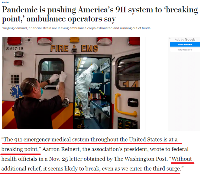 隨著疫情的失控,美國醫(yī)療體系已不堪重負,曾經(jīng)享譽全球的美國911急救系統(tǒng)也已接近極限。美國救護車協(xié)會主席阿倫·雷納特近日表示,如果沒有額外的政府援助,911急救系統(tǒng)終將在第三波疫情暴發(fā)之際崩潰。