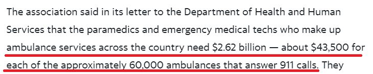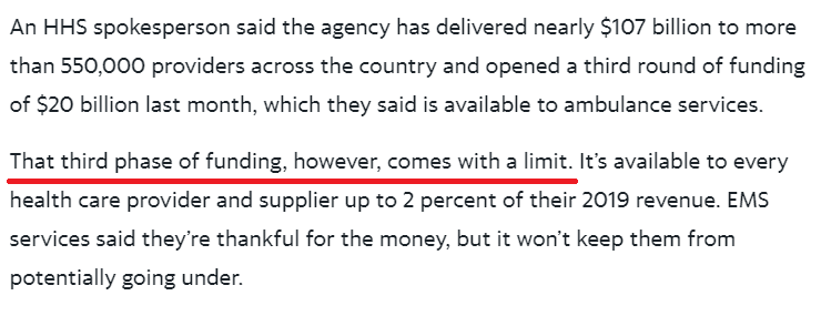 美國衛(wèi)生與公眾服務部的一名發(fā)言人稱,政府已向全美超過55萬家急救機構撥款近1070億美元,并且在上個月啟動了總額200億美元的第三輪援助。不過多家急救機構表示,這些援助并不足以幫助他們渡過難關。