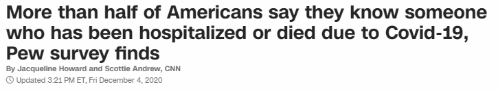 據(jù)美國媒體報道,在剛剛過去的一周,新冠肺炎成為美國人的第一大死因。皮尤研究中心日前公布的一項民調(diào)結(jié)果顯示,多達54%的美國成年人表示,他們認識的人中有人因感染新冠肺炎入院或死亡。