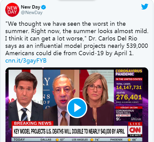 更可怕的是,華盛頓大學的研究人員使用模型做出了最新預測:到明年4月1日,將有大約53.9萬美國人死于新冠肺炎。