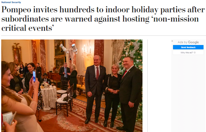 據(jù)《華盛頓郵報》報道,一位美國國務院官員證實,未來兩周時間里,國務院幾乎會“天天舉辦節(jié)日聚會”。比如,美國務卿蓬佩奧就決定在12月15日和16日大開“派對”,屆時將邀請數(shù)百人參加。