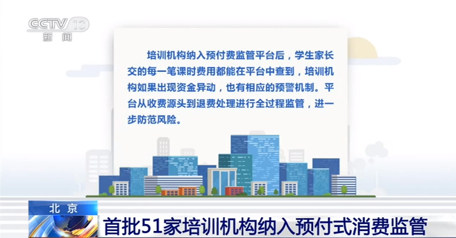 央視網(wǎng)消息:校外培訓機構(gòu)預收費的問題一直受到社會關(guān)注,如何防止“卷包跑路”?北京市試點開展預付式消費信用監(jiān)管平臺,重點解決培訓機構(gòu)預收費后監(jiān)管的問題,日前,北京公布了首批納入監(jiān)管的51家校外培訓機構(gòu)。