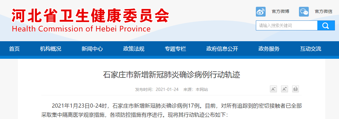 2021年1月23日0-24時,石家莊市新增新冠肺炎確診病例17例。目前,對所有追蹤到的密切接觸者已全部采取集中隔離醫(yī)學觀察措施,各項防控措施有序進行,F(xiàn)將其行動軌跡公布如下: