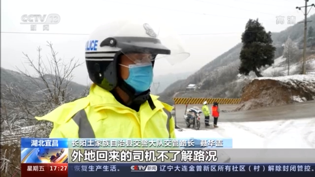 長陽土家族自治縣交警大隊(duì)交管“路長” 聶華蓋:這種環(huán)形路口的話在我們村里特別多,有的還是新路,路況特別復(fù)雜,外地回來的司機(jī)不了解路況,積雪太厚爬不上去,我們就可以協(xié)助他把防滑鏈裝好以后再走,萬一爬不上去就指條新路讓他繼續(xù)走。