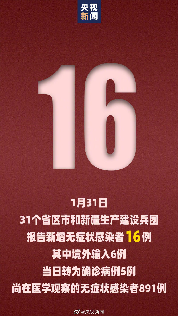 31個。ㄗ灾螀^(qū)、直轄市)和新疆生產(chǎn)建設(shè)兵團報告新增無癥狀感染者16例(境外輸入6例);當(dāng)日轉(zhuǎn)為確診病例5例(無境外輸入);當(dāng)日解除醫(yī)學(xué)觀察30例(境外輸入5例);尚在醫(yī)學(xué)觀察無癥狀感染者891例(境外輸入297例)。