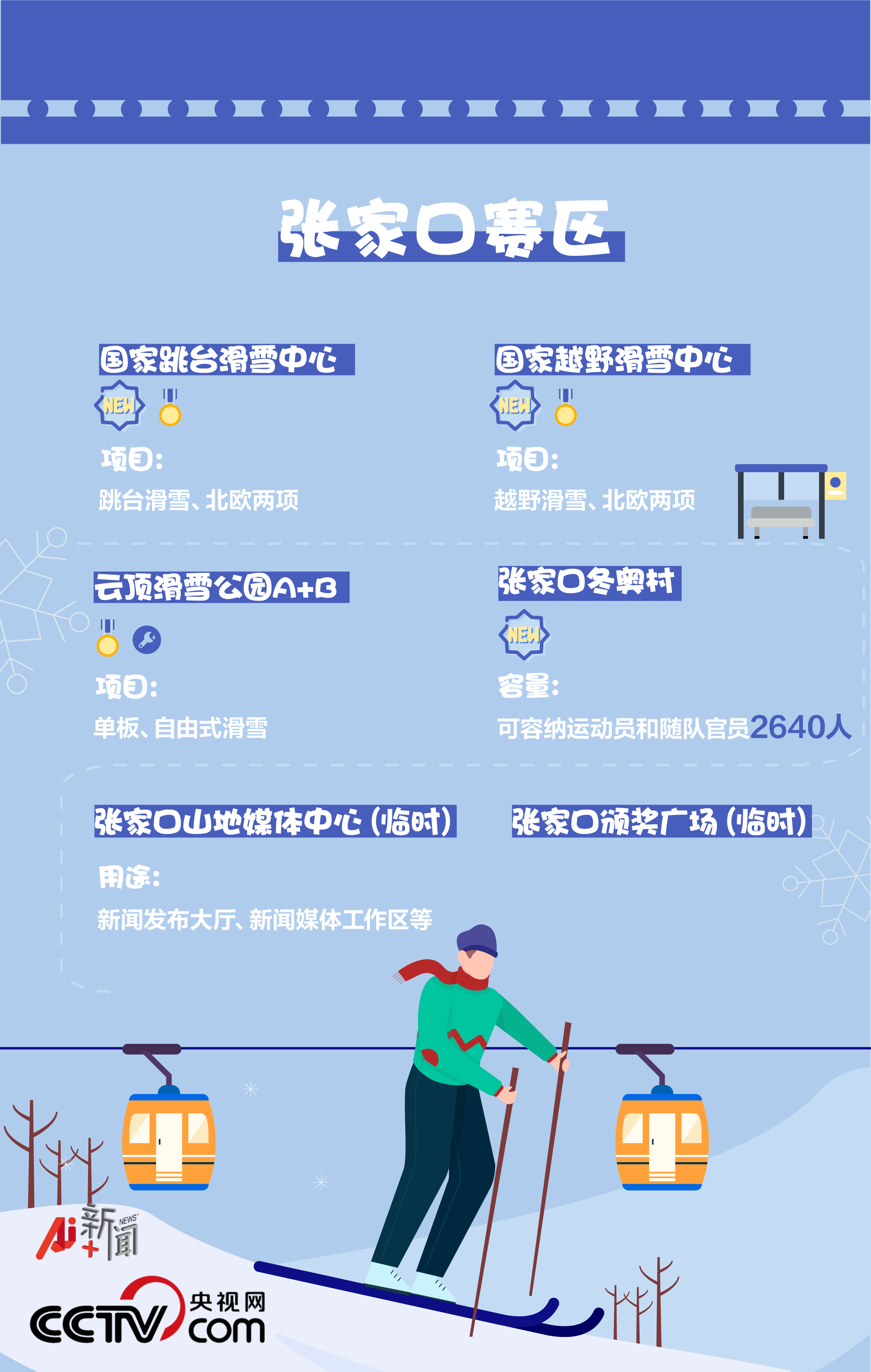張家口賽區(qū)位于河北省張家口市崇禮區(qū),共有7個(gè)競(jìng)賽和非競(jìng)賽場(chǎng)館,其中4個(gè)為新建場(chǎng)館、1個(gè)為現(xiàn)有場(chǎng)館、2個(gè)為臨時(shí)場(chǎng)館,將進(jìn)行2個(gè)大項(xiàng)(滑雪、冬季兩項(xiàng))、6個(gè)分項(xiàng)(冬季兩項(xiàng)、越野滑雪、跳臺(tái)滑雪、北歐兩項(xiàng)、自由式滑雪和單板滑雪)、51個(gè)小項(xiàng)的比賽。