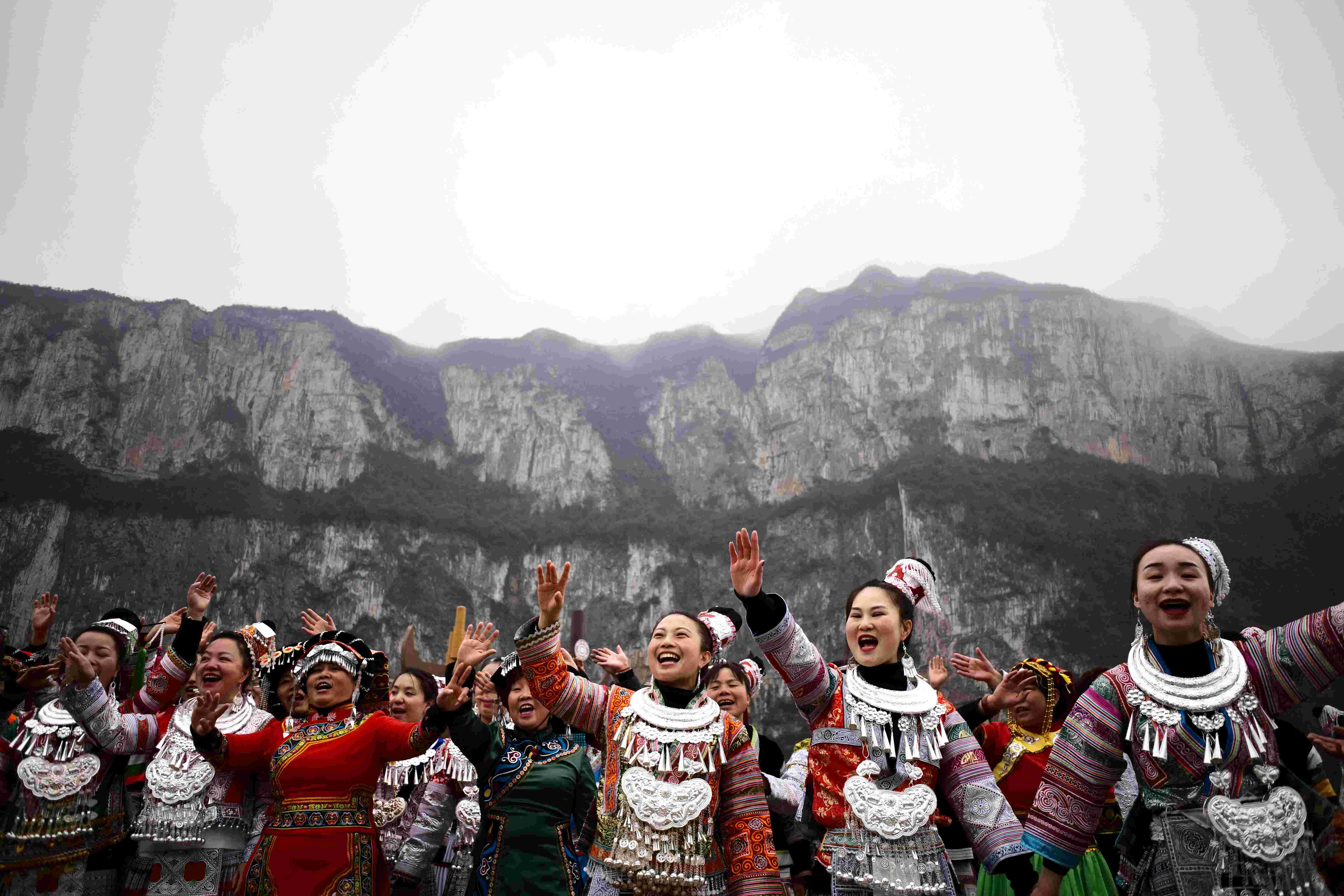 △2021年2月3日,貴州黔西縣化屋村,村民身著苗族服飾歡迎總書記的到來。(總臺央視記者王哈男拍攝)