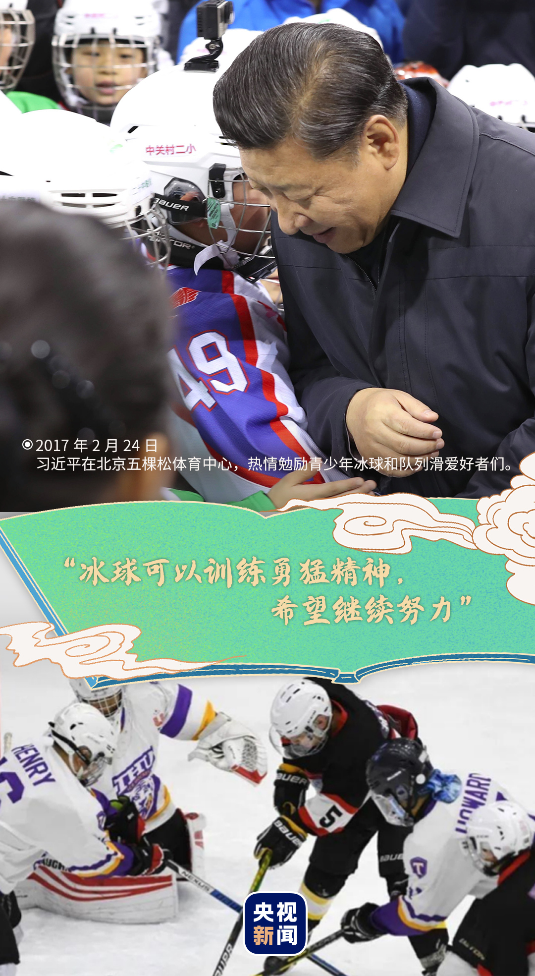 2017年2月24日,習近平總書記來到五棵松體育中心考察,同一群冰球少年親切交流。總書記還以冰球運動員特有的問候方式,同當時9歲的官子釗“撞肩”互動。