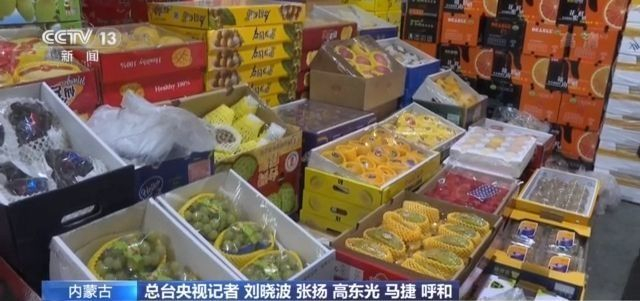 在呼和浩特的這家超市貨架上擺滿了琳瑯滿目的年貨,水果、堅果、蔬菜、蛋奶等商品讓人目不暇接。