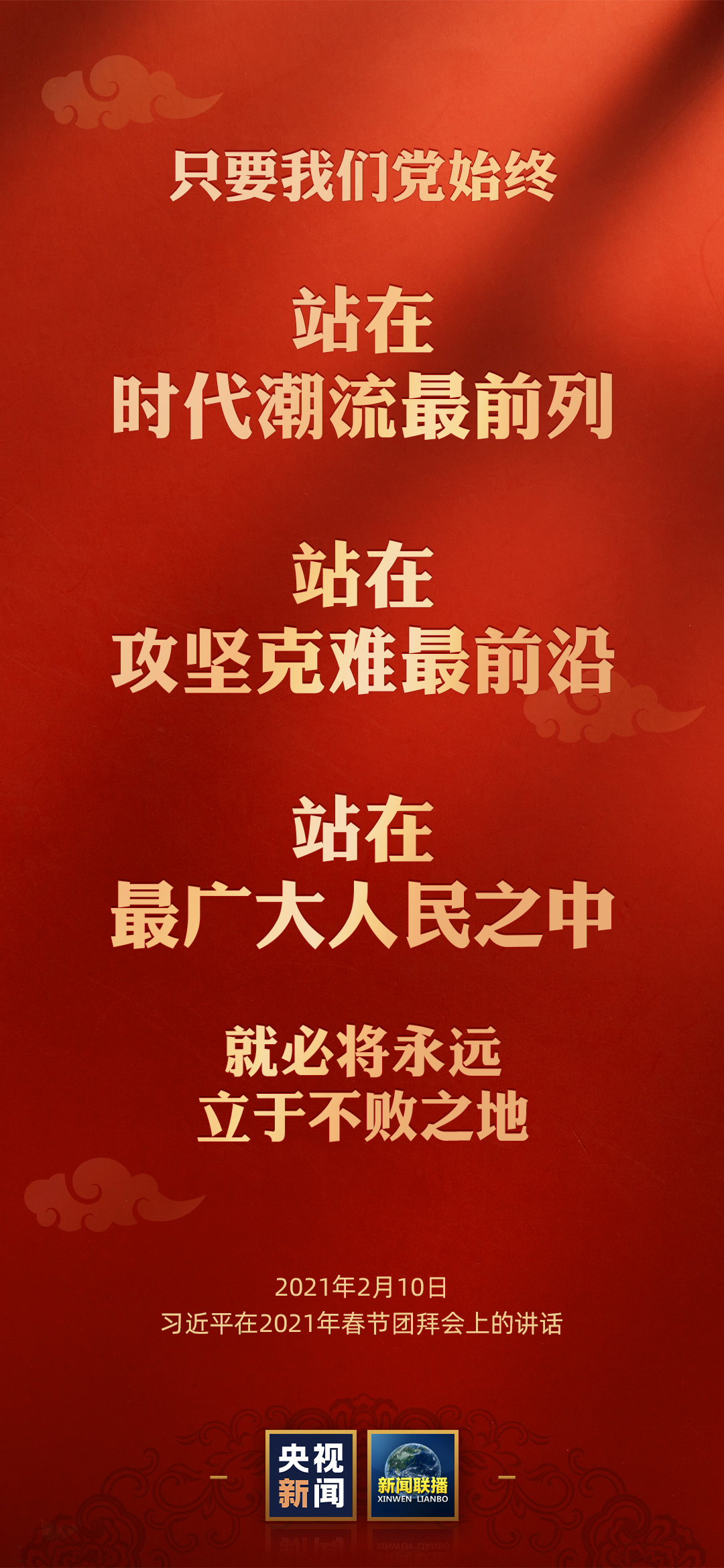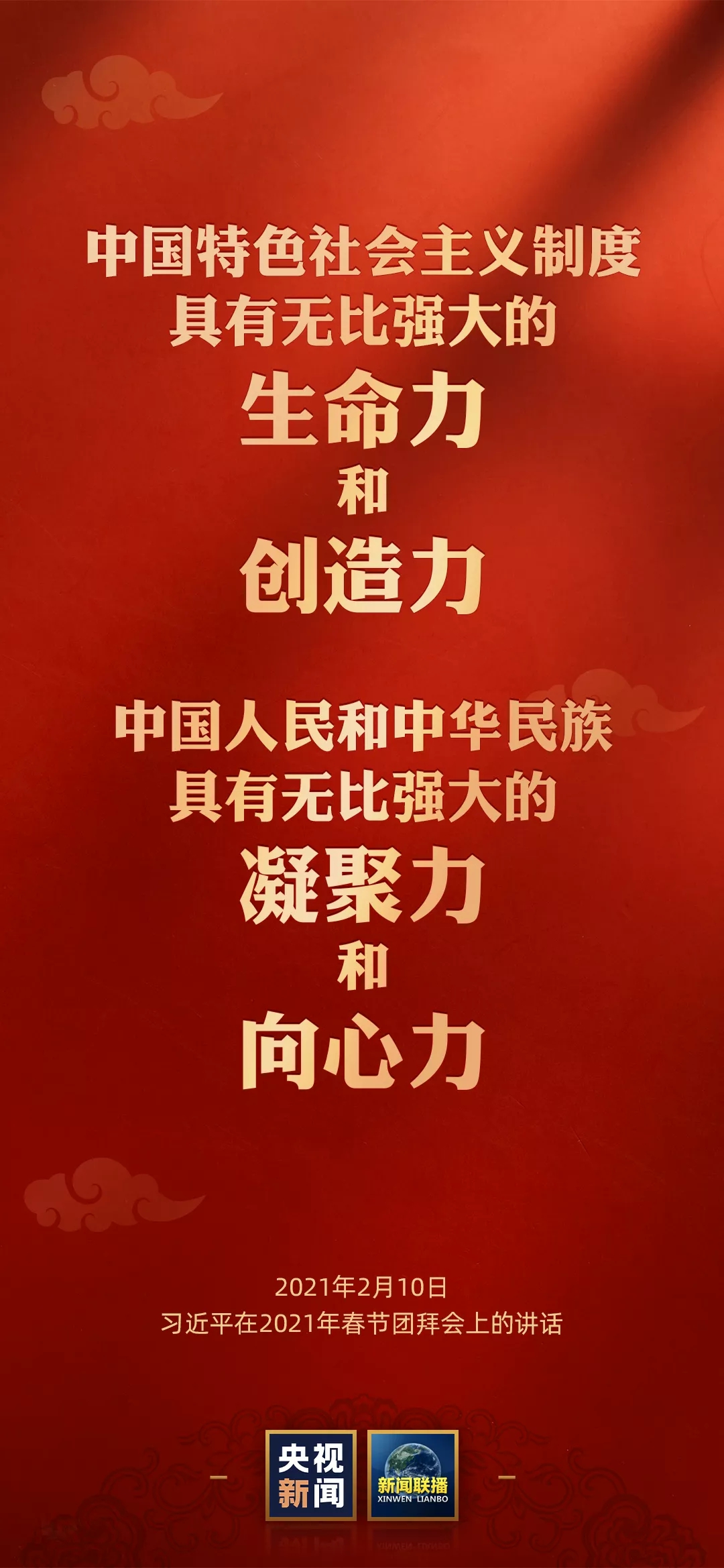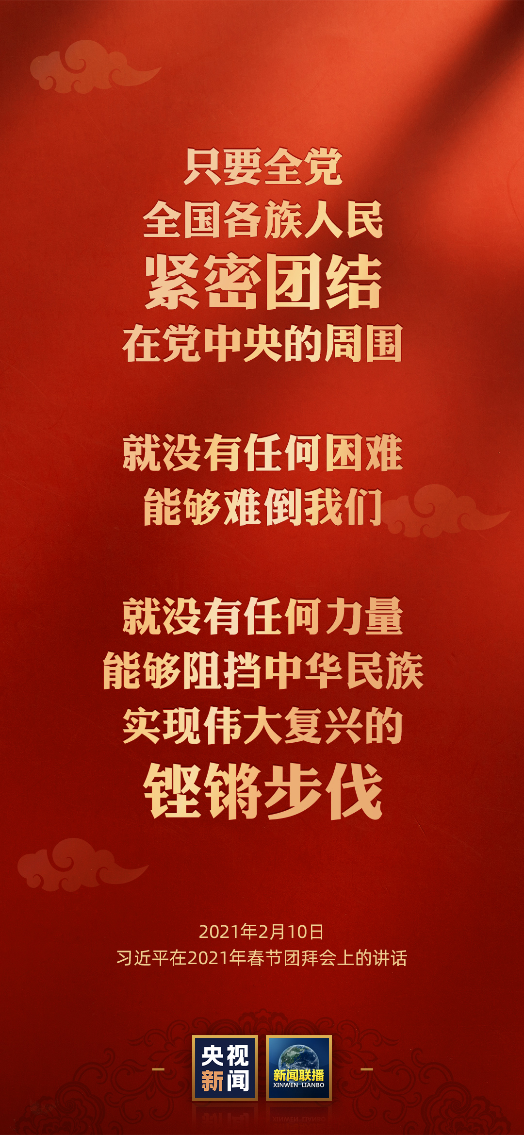 中共中央、國務(wù)院10日上午在人民大會堂舉行2021年春節(jié)團(tuán)拜會。中共中央總書記、國家主席、中央軍委主席習(xí)近平發(fā)表講話,代表黨中央、國務(wù)院,向全國各族人民,向香港特別行政區(qū)同胞、澳門特別行政區(qū)同胞、臺灣同胞和海外僑胞拜年↓
