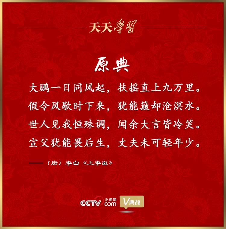 “大鵬一日同風起,扶搖直上九萬里”出自李白的七律《上李邕》,意思是大鵬總有一天會乘風飛起,憑借風力直上九天云外。該詩作于開元十四年(726年),李白時年26歲,詩句表達了青年李白的凌云壯志和強烈的用世之心。