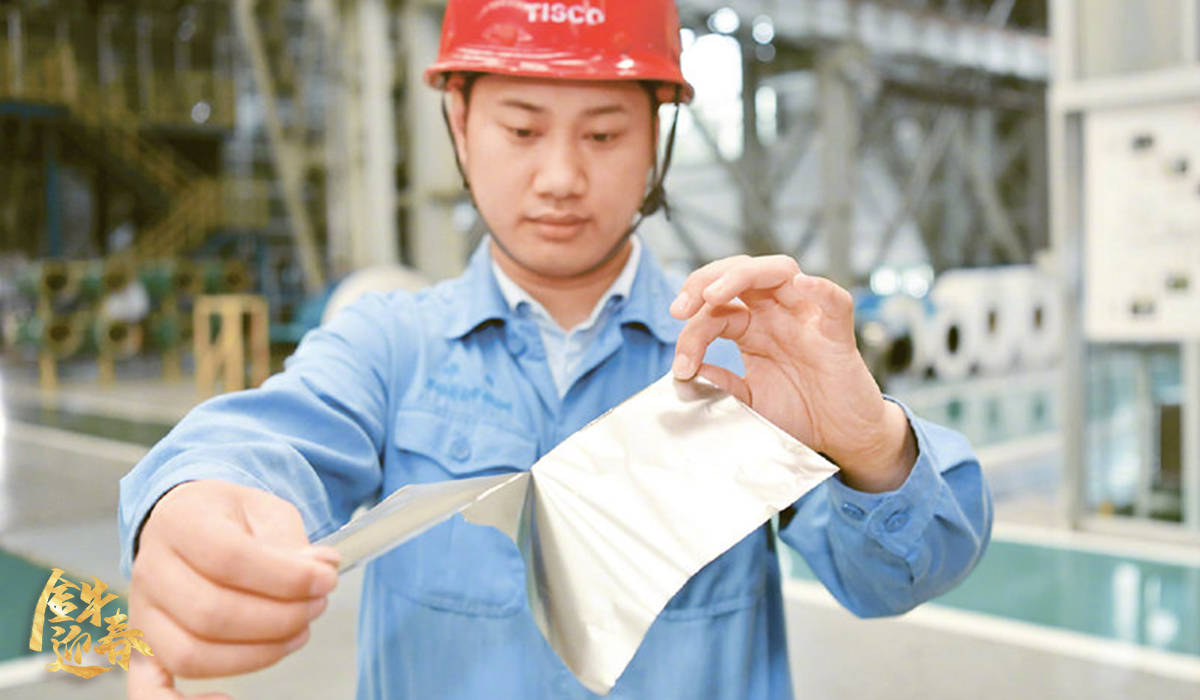 太鋼不銹鋼精密帶鋼有限公司員工在展示用手撕開(kāi)0.02毫米厚的寬幅軟態(tài)不銹鋼精密箔材。