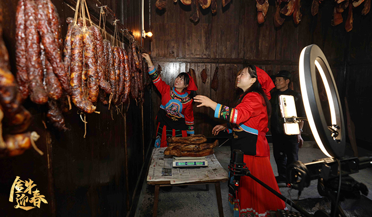 2021年1月15日,電商服務(wù)志愿者通過(guò)直播的方式幫助偏遠(yuǎn)山村群眾推介銷(xiāo)售臘肉、香腸等特色“年味”農(nóng)產(chǎn)品。