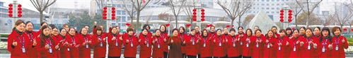 2月12日,江蘇省南通市亞萍國際購物商場前,留在當(dāng)?shù)剡^大年的員工聚在一起,喜迎新春。 季燁煒攝