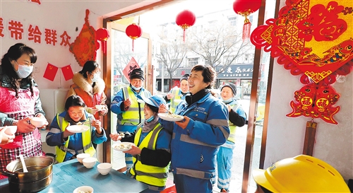 2月12日,安徽省滁州市瑯琊區(qū)鳳凰社區(qū)鳳凰西路紅色驛站,社區(qū)志愿者為堅(jiān)守在一線的環(huán)衛(wèi)工人免費(fèi)提供熱騰騰的愛心水餃,讓就地過年的環(huán)衛(wèi)工人感受到“家”的味道。 李曉村攝