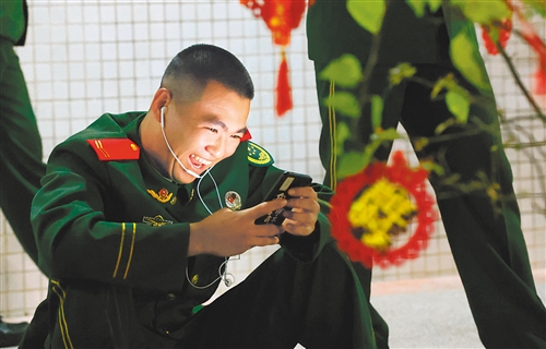 2月11日,武警廣東總隊(duì)執(zhí)勤第三支隊(duì)三中隊(duì)上等兵陳俊江在與家人視頻拜年。 廖 鍵攝
