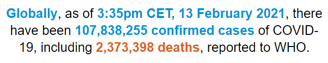 根據(jù)世衛(wèi)組織最新實時統(tǒng)計數(shù)據(jù),截至歐洲中部時間2月13日15時35分(北京時間2月13日22時35分),全球累計新冠肺炎確診病例107838255例,累計死亡病例2373398例。13日全球新冠肺炎確診病例新增410876例,死亡病例新增12958例。