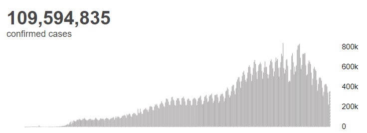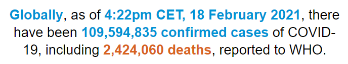 根據(jù)世衛(wèi)組織最新實時統(tǒng)計數(shù)據(jù),截至歐洲中部時間2月18日16時22分(北京時間2月18日23時22分),全球累計新冠肺炎確診病例109594835例,累計死亡病例2424060例。18日全球新冠肺炎確診病例新增363654例,死亡病例新增9619例。
