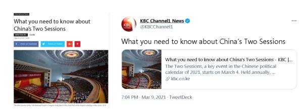 兩會期間,為了讓非洲普通民眾對于兩會有一個基本的認識,肯尼亞廣播公司和非洲總站展開密切合作。9日以來,肯尼亞廣播公司旗下的媒體網(wǎng)站以及新媒體平臺分別轉(zhuǎn)發(fā)了總臺文章《你需要了解的中國“兩會”知識點》,從兩會的由來、召開時間地點、與會人員構(gòu)成、今年重點議題等都做了詳細的介紹。除此之外,肯尼亞廣播公司新媒體端還陸續(xù)轉(zhuǎn)載總臺制作的多篇兩會報道,包括《中西方政治體制區(qū)別介紹》《非洲為什么需要關(guān)注中國兩會》《2021中國兩會成果》等一系列報道。肯尼亞廣播公司是肯尼亞國家媒體,重點報道肯尼亞國內(nèi)政治、經(jīng)濟、社會民生新聞,也關(guān)注非洲和世界時事,有廣播、電視、新媒體等多個發(fā)稿平臺。