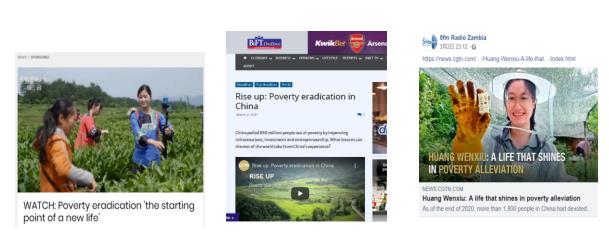 △南非獨立傳媒網(wǎng)站、加納《商務(wù)金融時報》、贊比亞5FM電臺對于中國脫貧經(jīng)驗的報道截圖